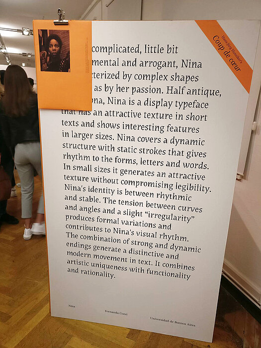 Die Ausstellung wurde durch große Ausstellungstafeln realisiert, auf denen sich ein in Englisch verfasster Text der Schriftdesigner*innen befindet, welcher die Schrift aus deren Perspektive beschreibt. Impressionen befinden sich in der Bilderstrecke.