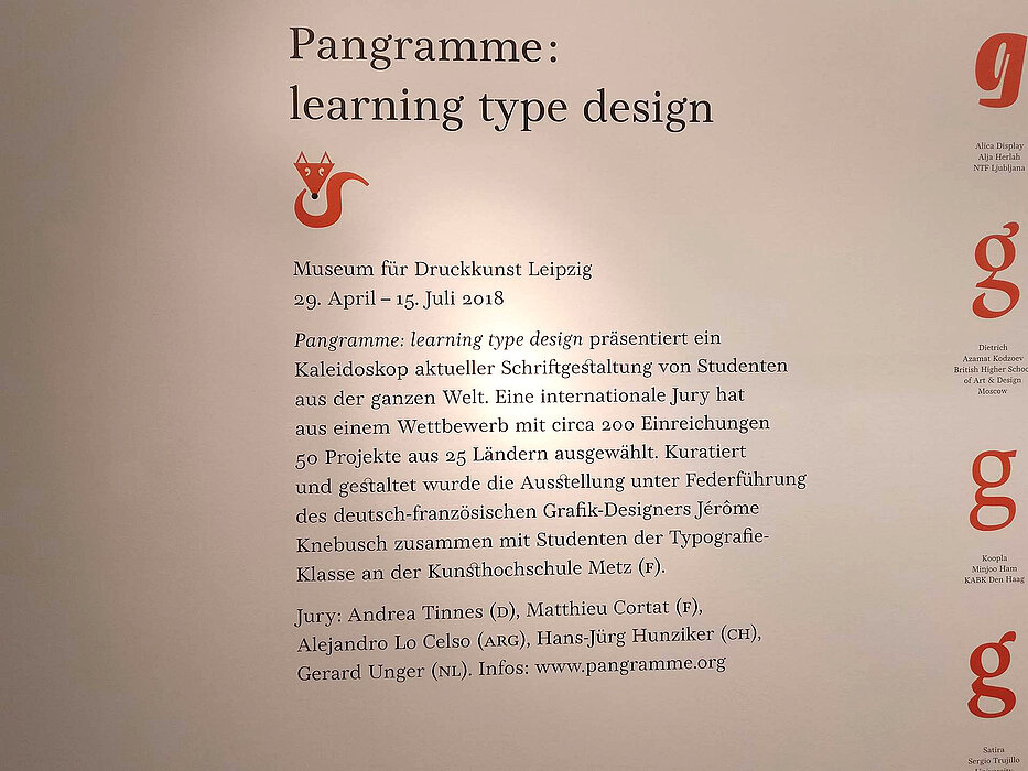 Am 27. April 2018 fand die Vernissage zur Ausstellung Pangramme: learning type design im Museum für Druckkunst in Leipzig durch einen Einführungsvortrag von Jérôme Knebusch statt.
