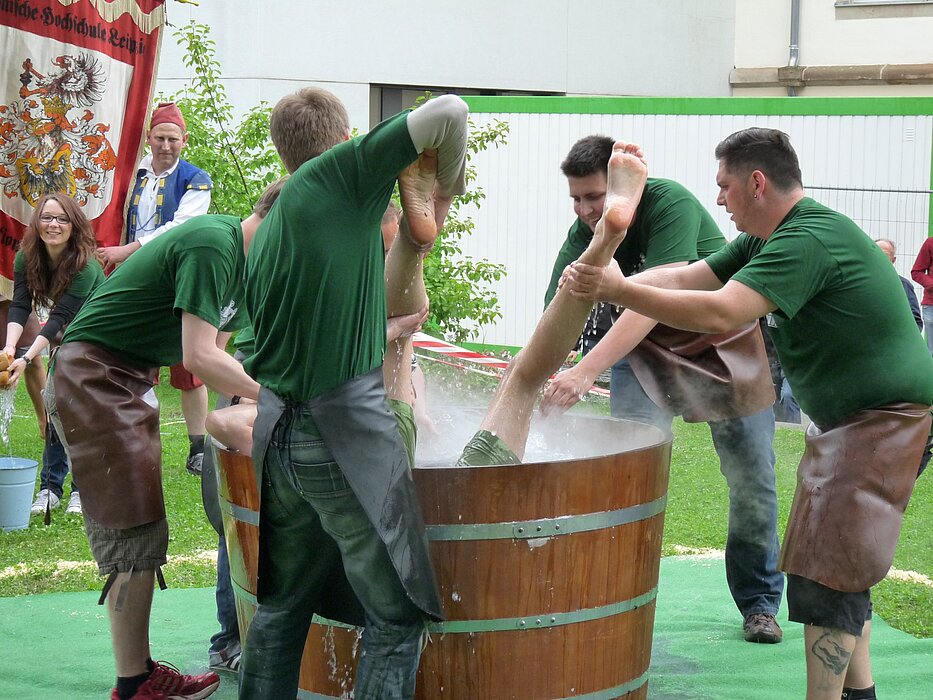 Am Mittwoch den 29. Mai 2013 zwischen 14 und 15 Uhr fand auch in diesem Jahr das traditionelle Gautschfest der HTWK Leipzig statt. Zahlreiche Kornuten der Fakultät Medien hatten sich angemeldet und als Beweis ihrer Tauglichkeit das Bleisatzpraktikum absolviert, um die innere und äußere Reinigung am eigenen Leib zu erfahren. Zum ersten Mal lud die Fakultät nicht zum Gutenbergplatz, sondern in die Gustav-Freytag-Straße, in den Hinterhof des neuen Gebäudes der Fakultät Medien und des Medienzentrum ein. Trotz anfänglichen Regens und eher kühler Temperaturen trauten sich neben den Gautschlingen auch zahlreiche Gäste in die Nähe des Gautschbottichs.