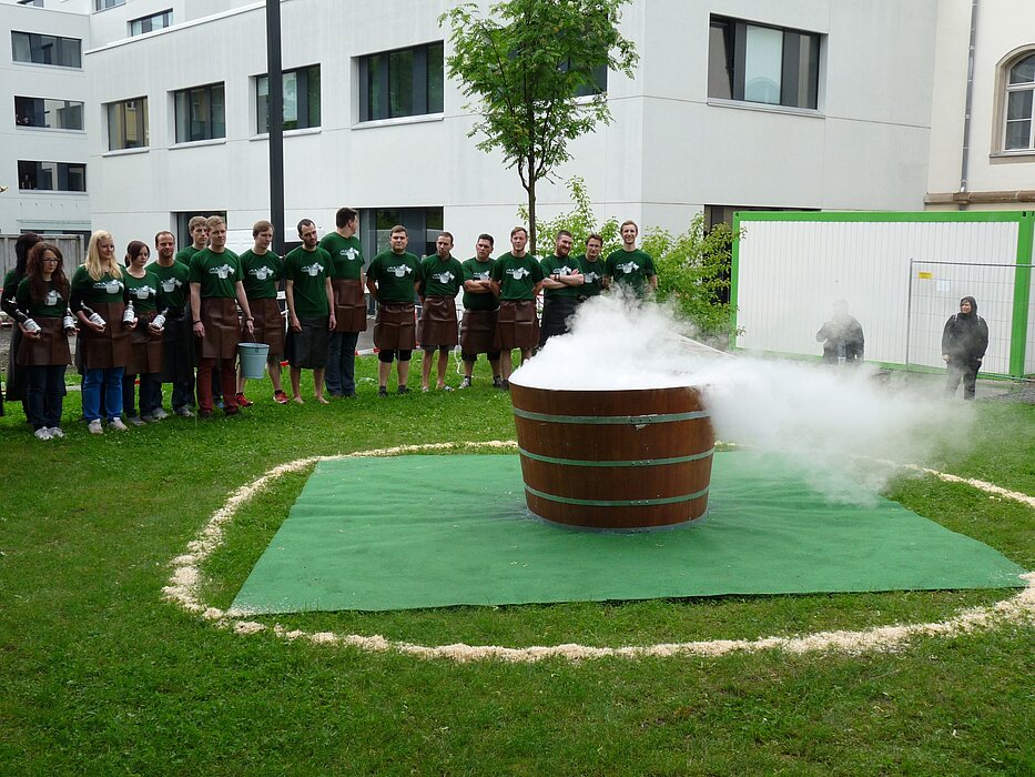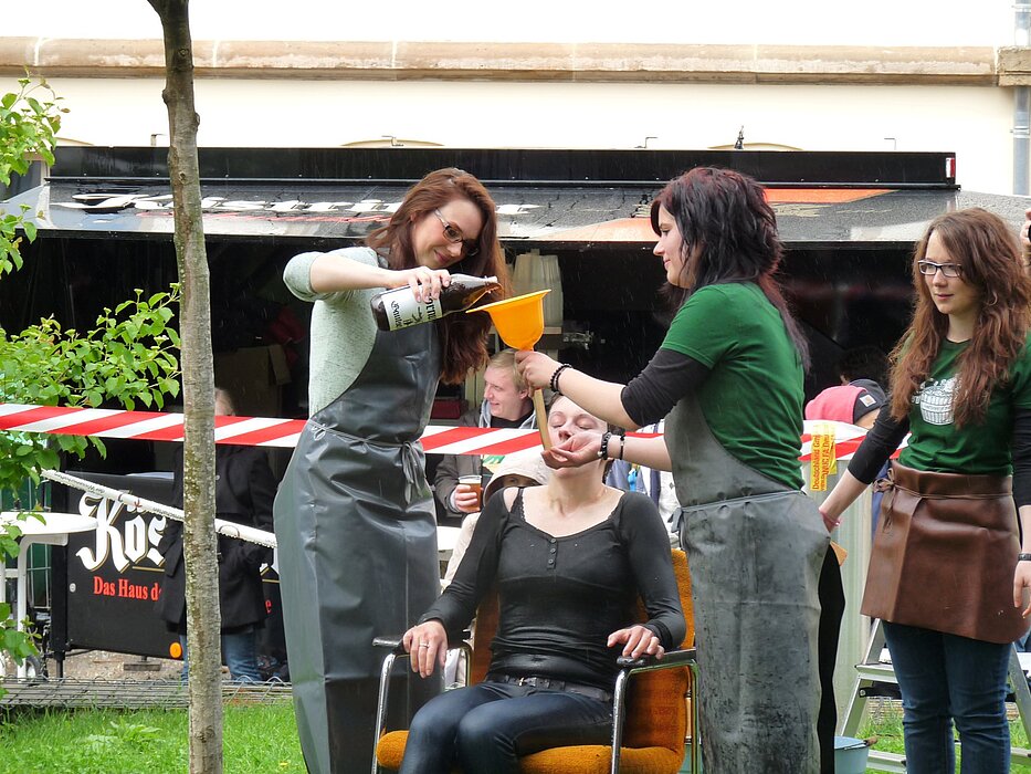 Auch dieses Jahr landeten ohne Ausnahme alle im (zugegebener Maßen wegen der niedrigen Umgebungstemperatur leicht angewärmten) Wasser des Bottichs. Nach dieser äußeren Reinigung warteten direkt im Anschluss die Schwammhalter auf die durchnässten Kornuten. Auf einem mit Schwämmen versehenen Stuhl wurde ihnen nun über einen Trichter eine streng geheime Flüssigkeit eingeflößt (bekannt über diese ist nur, dass sie wohl nicht die wohlschmeckendste sei). Nach dieser feuchtfröhlichen Prozedur hatten sich die Gautschlinge ihre Aufnahme in den Kreis der Drucker verdient. Jeder erhielt in feierlicher Atmosphäre seinen individuellen Gautschbrief.