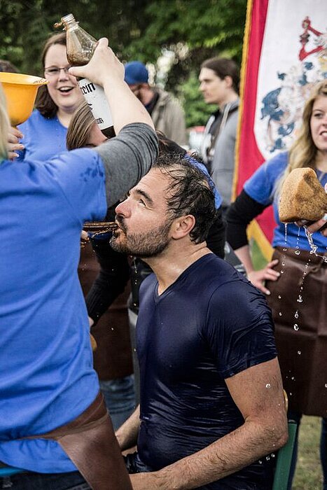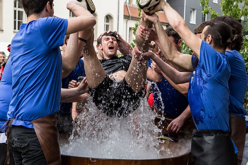 Besonderes Highlight des Gautschfestes war die Reinigung der drei „Ehrengautschlinge“. Jörg Ackermann, Professor für Technologieplanung in der Medienindustrie, Marc Liesching, Professor für Medienrecht und Medientheorie und Magnifizenz, Frau Professorin Gesine Grande, die im Juli letzten Jahres zur neuen Rektorin der HTWK Leipzig gewählt wurde. Auch diese konnten sich der Druckertradition nicht entziehen und landeten unter besonders starkem Beifall ebenso im kühlen Nass, wie die Studenten.