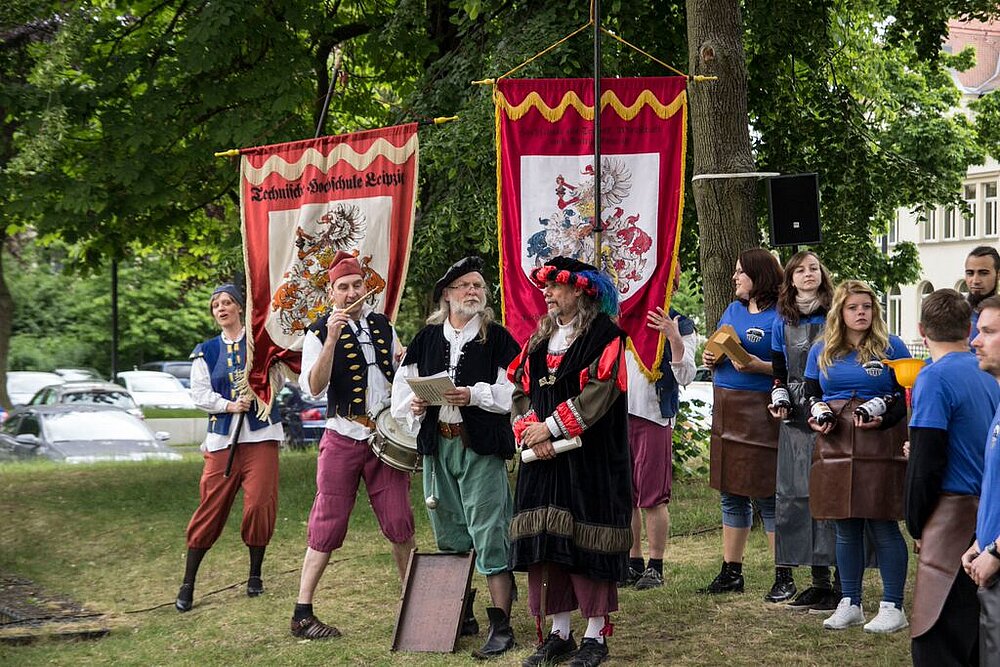 Am Mittwoch, dem 27. Mai 2015, wurden traditionell die Studierenden der Fakultät Medien und drei „Ehrengautschlinge“ der HTWK Leipzig auf der Gautschwiese hinter dem Gutenbergbau gegautscht. Knapp 50 Kornuten stellten sich der Druckertradition.