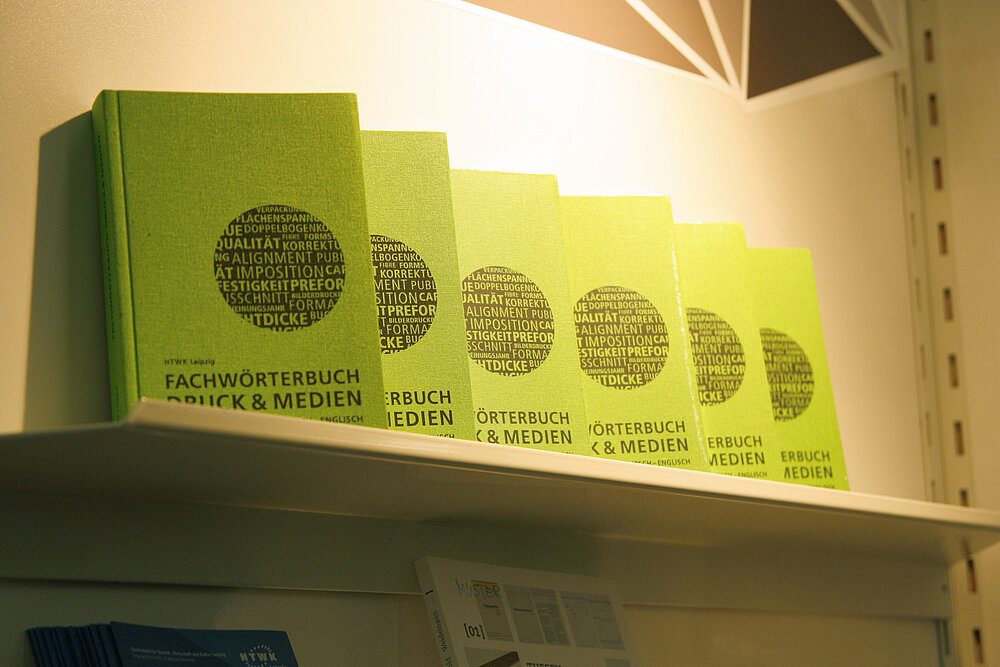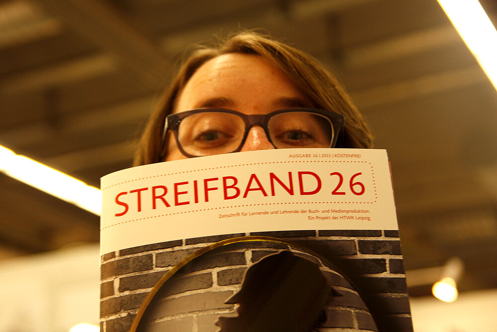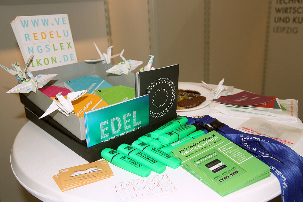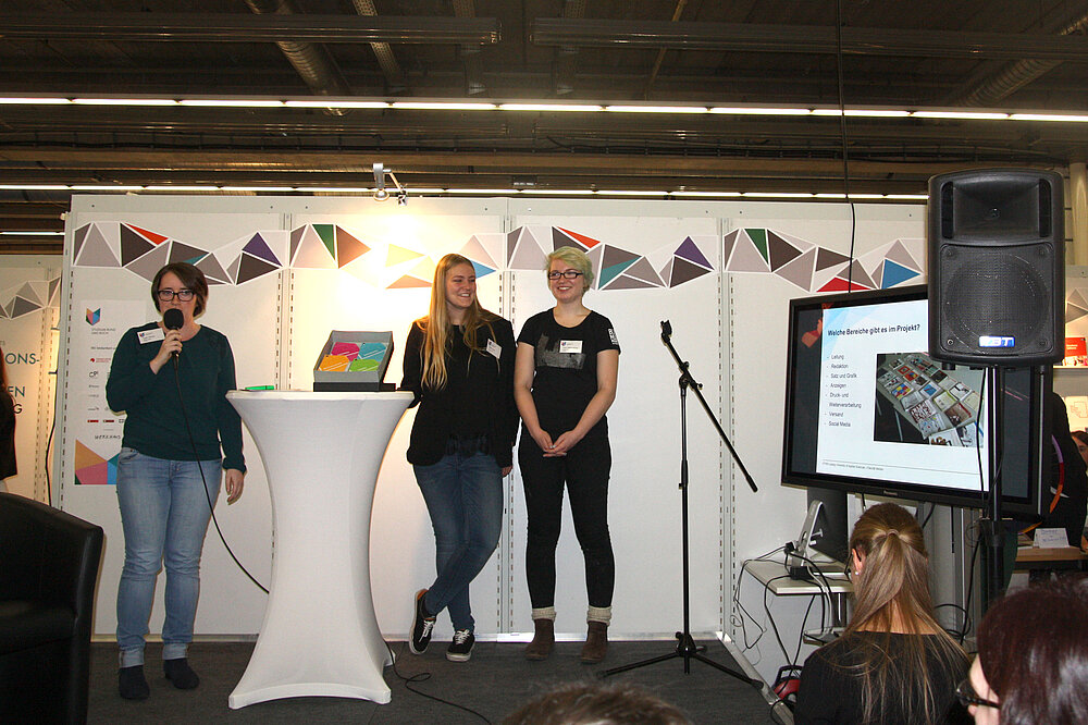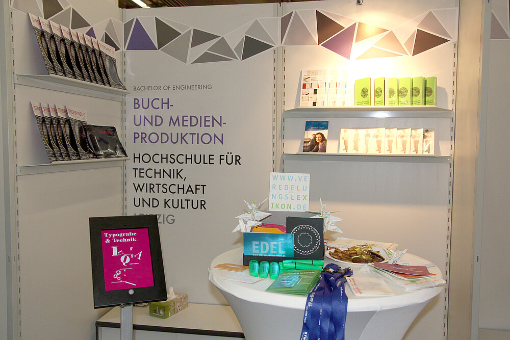 Freitag stand schließlich noch die Vorstellung unserer studentischen Projekte auf dem Programm. Wir präsentierten zunächst das Konzept unseres Moduls Projektmanagement und anschließend die neuen Ausgaben des Fachwörterbuchs, des Typomagazins, des Veredelungslexikons sowie der Zeitschrift Streifband. So konnten wir interessierten Studierenden anderer Hochschulen sowie Schülern und Auszubildenden der Branche einen Einblick in unsere Arbeiten geben. Das Fachwörterbuch- und Typomagazin-Team produzierte dafür eigenhändig ein kleines Informationsvideo, eine Vertreterin des Streifbandprojekts gestaltete eine Präsentation. So endete der zweite Messetag für das PR-Team.