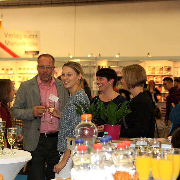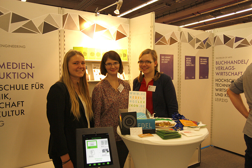 Am Donnerstag stellten wir zusammen mit dem Studiengang Buchhandel und Verlagswirtschaft in einem Interview den Ablauf und die Inhalte unserer Studiengänge genauer vor. Der nächste Punkt auf unserer Tagesordnung war die Podiumsdiskussion im Forum Verlagsherstellung zum Thema „Buchveredelung – darf‘s auch umweltfreundlich sein?“. Als Einstieg stellte Miriam Amin, Absolventin des Studiengangs Buch- und Medienproduktion, einen Auszug aus ihrer Bachelorarbeit „Analyse von Veredelungsverfahren unter Umweltaspekten“ vor. Danach begann die Diskussion mit Professor Christian Ide als Moderator sowie vier weiteren Gästen aus Verlags- und Umweltbranche. Im Anschluss konnten Absolventen, Professoren und Dozenten bei einem Glas Sekt auf unserem Absolvententreffen ins Gespräch kommen. Damit endete ein aufregender und erfolgreicher Tag auf der Messe.