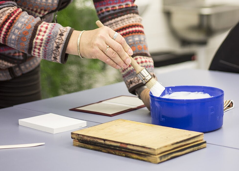 Einfach gesagt, stellen die Studenten hier ein eigenes Buch her. Sie wählen die Materialien selbst aus, fügen diese zu einer Buchdecke und komplettieren diese zum Schluss zu einem Buch mit Maximalausstattung! Das heißt: Kapitalband, Leseband und Farbschnitt. Aber grundlegend kann man sagen, dass das Praktikum als Einstieg dient. Die Studierenden können sich mit den Materialien, mit denen sie zukünftig zu tun haben, vertraut machen. Sie sollen ein Gespür für Haptik, Effekte und die Wechselwirkungen zwischen den Materialien bekommen. Natürlich auch die Freude daran, etwas selbst zu erschaffen und diese Erfahrung mit nach Hause zu nehmen. Wichtig ist auch, dass die Studierenden einen Bezug zu den Schritten der handwerklichen Herstellung haben, die Ihnen im Studium und später auch in der industriellen Produktion immer wieder begegnen.